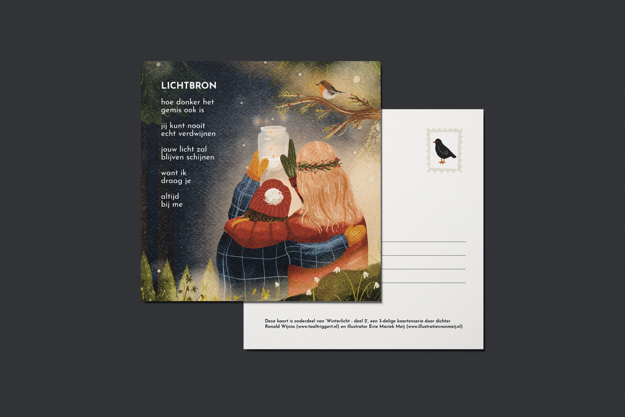 In oktober '24 brachten Taaltriggert en ik onze tweede Winterlicht serie uit - 'Winterlicht - deel 2', een serie bestaande uit 3 ansichtkaarten. Deze kaart behoort tot de serie. Naast dat we allebei onze eigen winterkaarten hebben, leek ons een samenwerking erg tof: onze werken versterken elkaar en onze werken krijgen hierdoor een diepere betekenis.