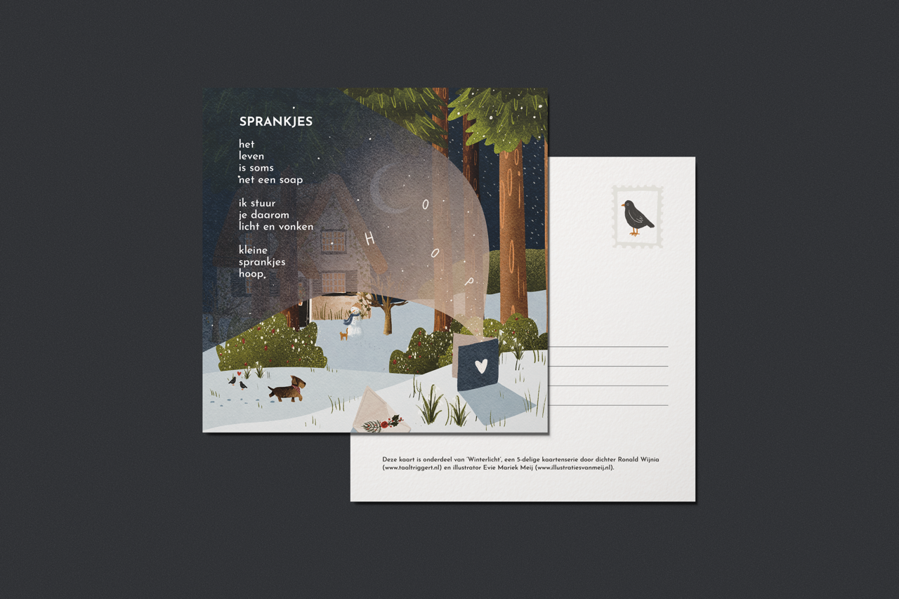 Van oktober tot eind november '23 werkten dichter Taaltriggert en ik samen aan een mooie set winterkaarten, met als titel Winterlicht. Naast dat we allebei onze eigen winterkaarten hebben, leek ons een samenwerking erg tof: onze werken versterken elkaar en onze werken krijgen hierdoor een diepere betekenis.