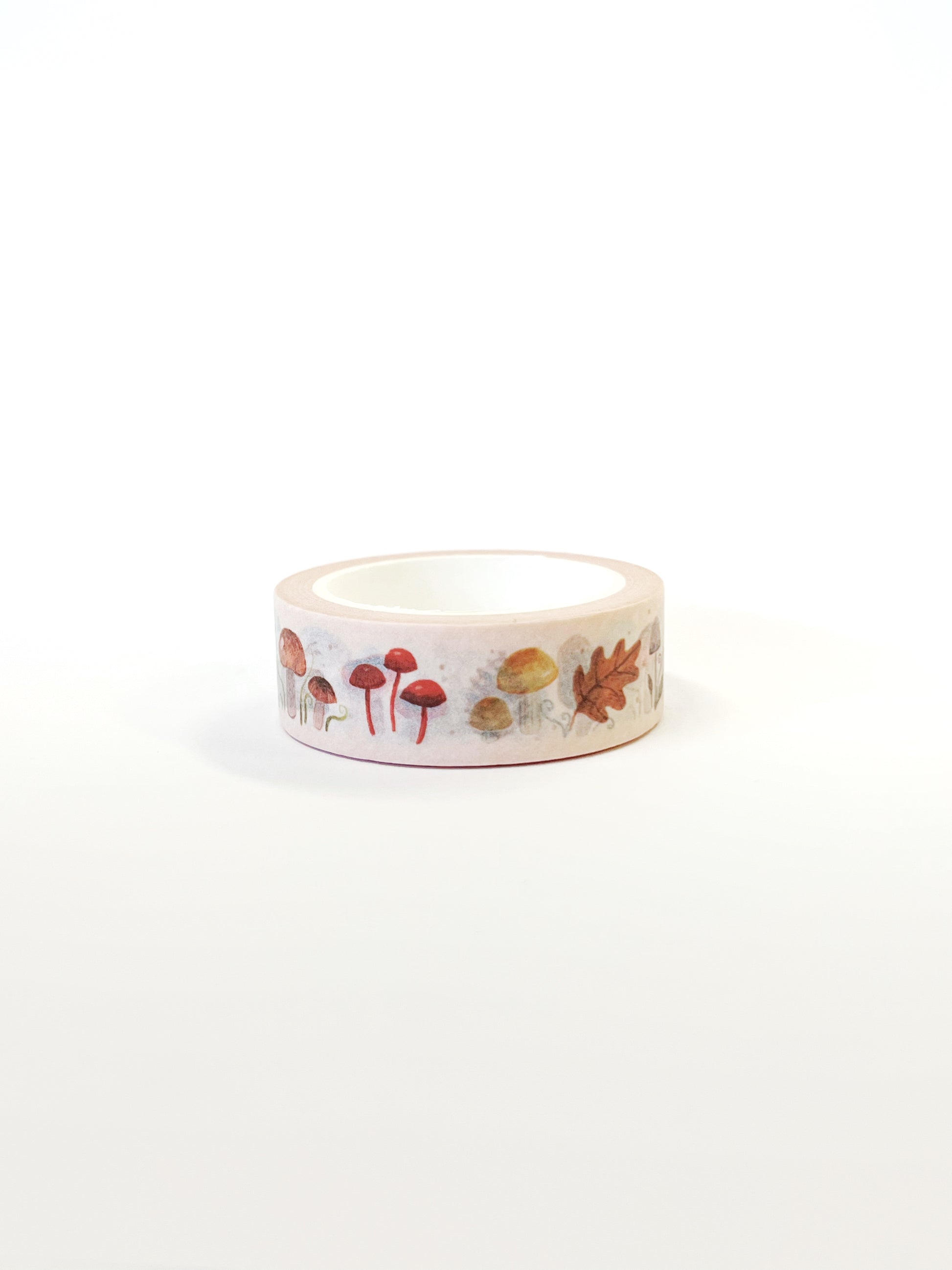 De illustraties van paddenstoelen geven deze tape een gezellige en natuurlijke sfeer, perfect voor liefhebbers van bos, natuur en herfstillustraties.